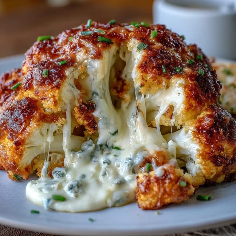 Save I wasn't planning to impress anyone the night my friend casually mentioned she'd gone vegetarian, but there it was on the counter—a perfect, dense cauliflower head that somehow felt like a challenge wrapped in green leaves. Something about its roundness made me think it could be more than just roasted florets on a sheet pan. I started cutting into it experimentally, imagining creamy cheese nestled between the crevices, and by the time the oven preheated, I'd convinced myself this was going to work. That first golden-brown cauliflower, sliced into wedges at the table with cheese oozing from the center, turned the whole meal into something unexpected and memorable.