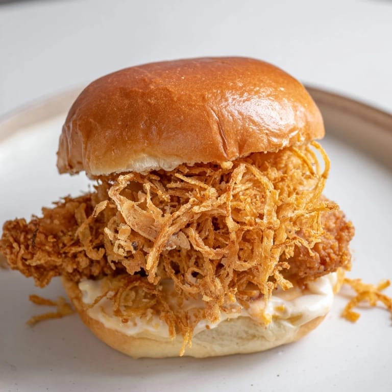Save The sizzle hit my ears before the smell even reached me. I was standing over a skillet full of golden onion rings, watching them curl and crisp, when I realized I'd stumbled onto something bigger than a side dish. That batch of fried onions ended up piled onto a chicken sandwich I'd made for lunch, and suddenly everything clicked. The crunch, the sweetness against the savory fried chicken, the way the aioli held it all together. I've been making this sandwich ever since, tweaking and perfecting it until it became the kind of meal that makes people lean back in their chairs and go quiet for a minute.