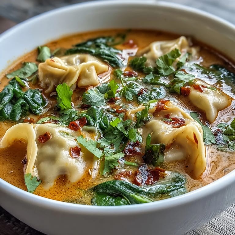 Save Experience a burst of Thai-inspired flavors with this Red Curry Wonton Soup With Greens. This vibrant dish combines the convenience of frozen wontons with a rich, aromatic coconut broth infused with fresh ginger and garlic. It is a nourishing, comforting meal that looks and tastes like a restaurant favorite, yet it is simple enough for any weeknight.
